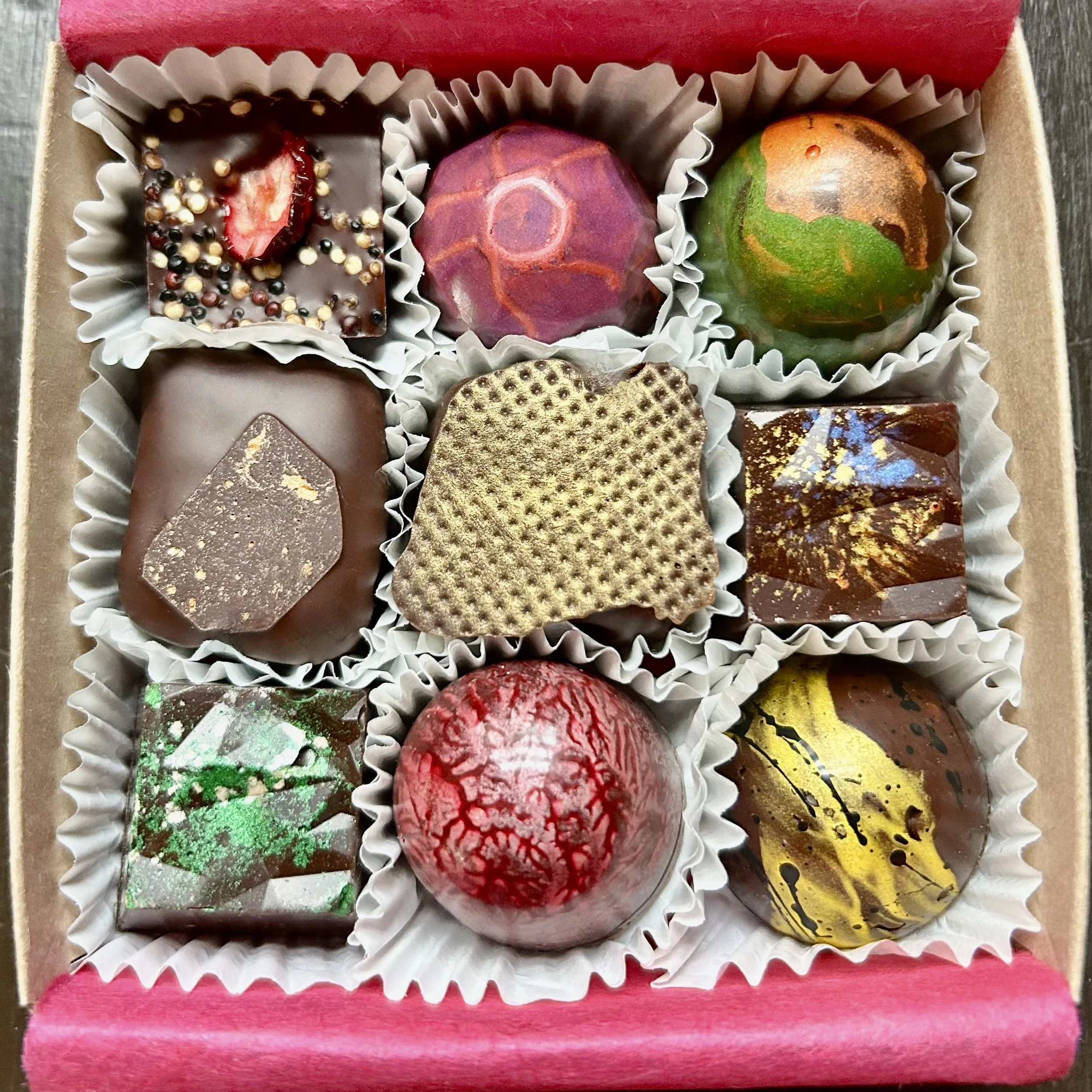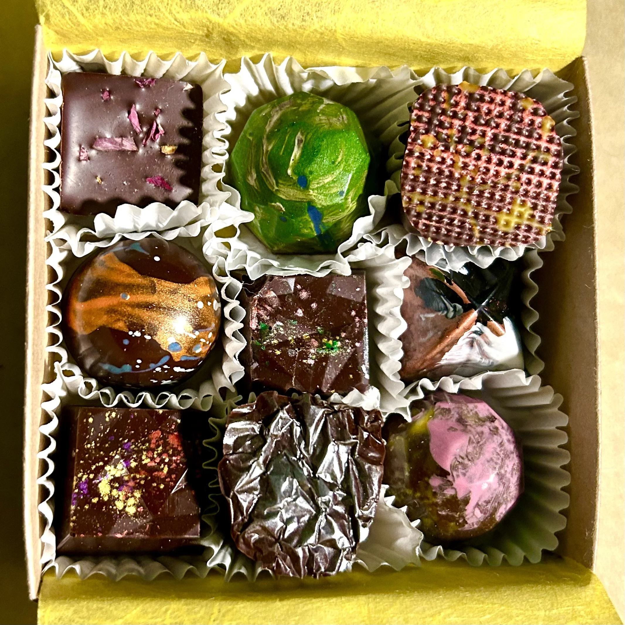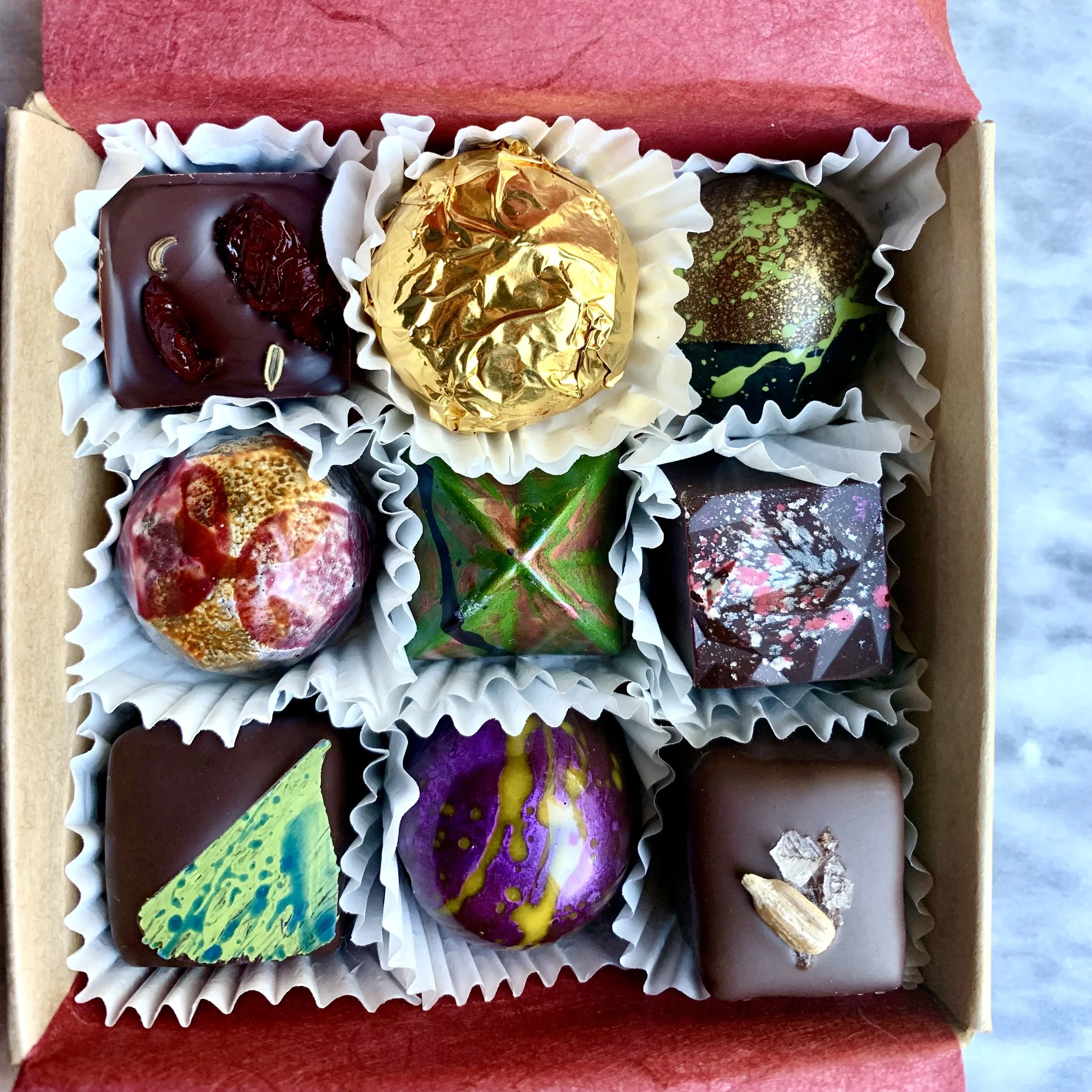 Heirloom Alto Beni Bolivian 65% Dark Milk Chocolate with Toasted Quinoa and Cranberry, Saffron, Tahini, Caramelized Milk Chocolate, Mango w/ Kashmiri Chili Marshmallow, Peach Pâte de Fruit & Pecan Gianduja, Chestnut Rye Whiskey, Pomelo Gin White Chocolate, Black Lime & Cardamom White Chocolate w/Whole Green Szechuan Peppercorn, Cherry w/ Almond Praline, Pineapple Tamari Star Anise Caramel