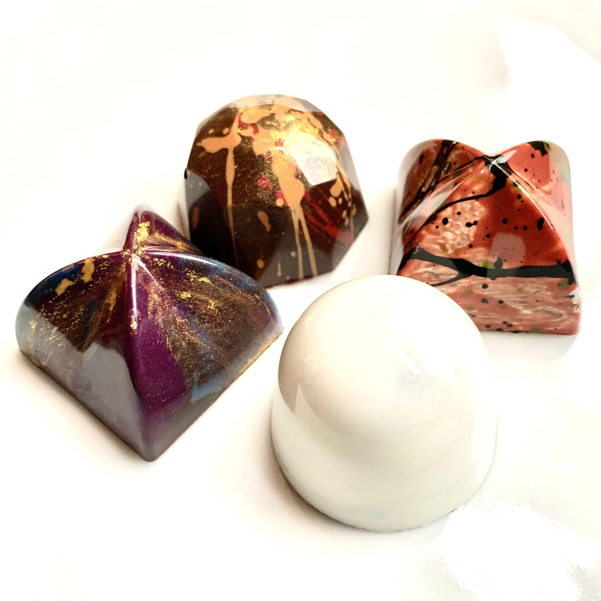 The Du Fu: Juniper and citrus white chocolate and sesame gianduja: “Bitter juniper berries are food/ for immortals, and cirrus flushed with morning/ light.” Spare, lyrical, earthy flavors.