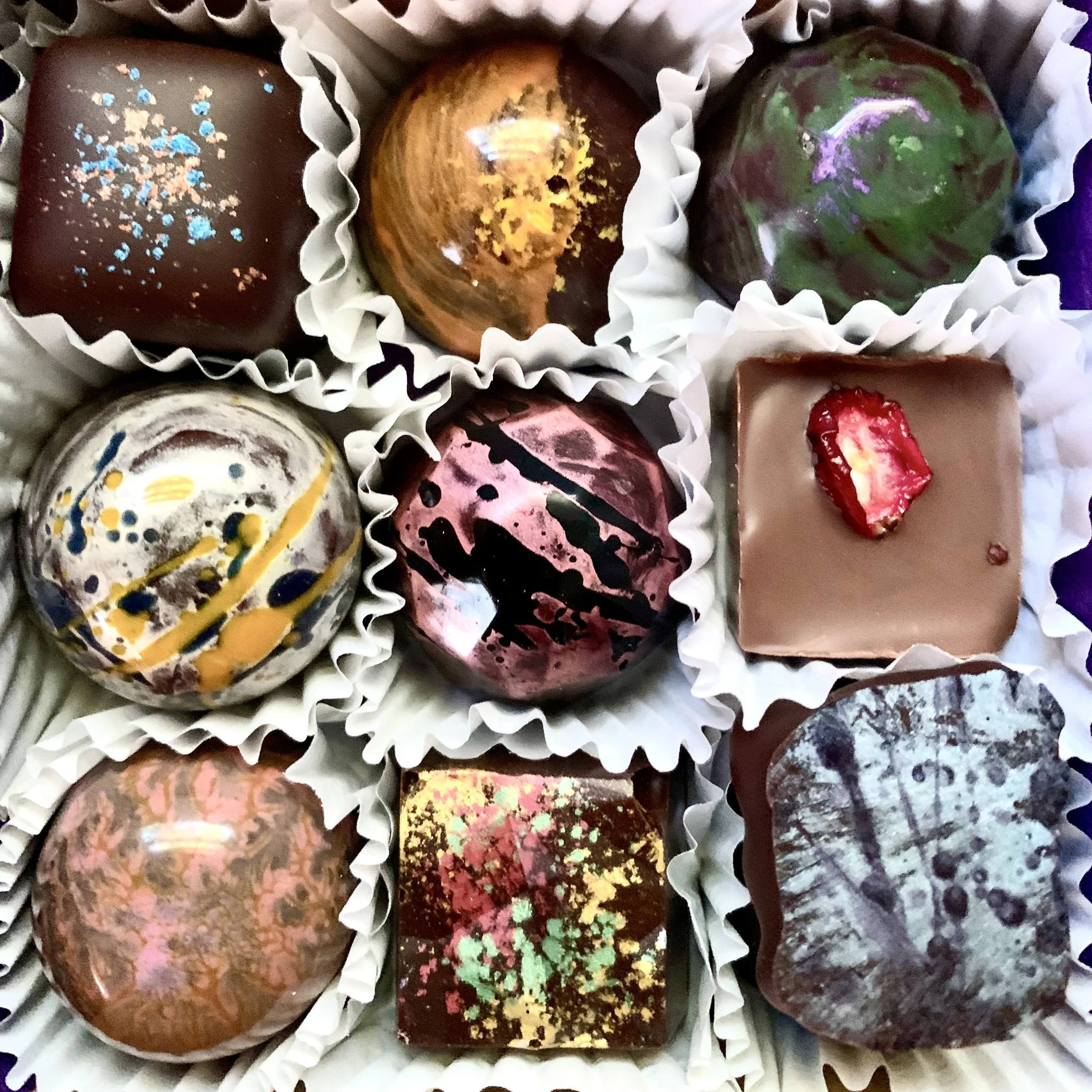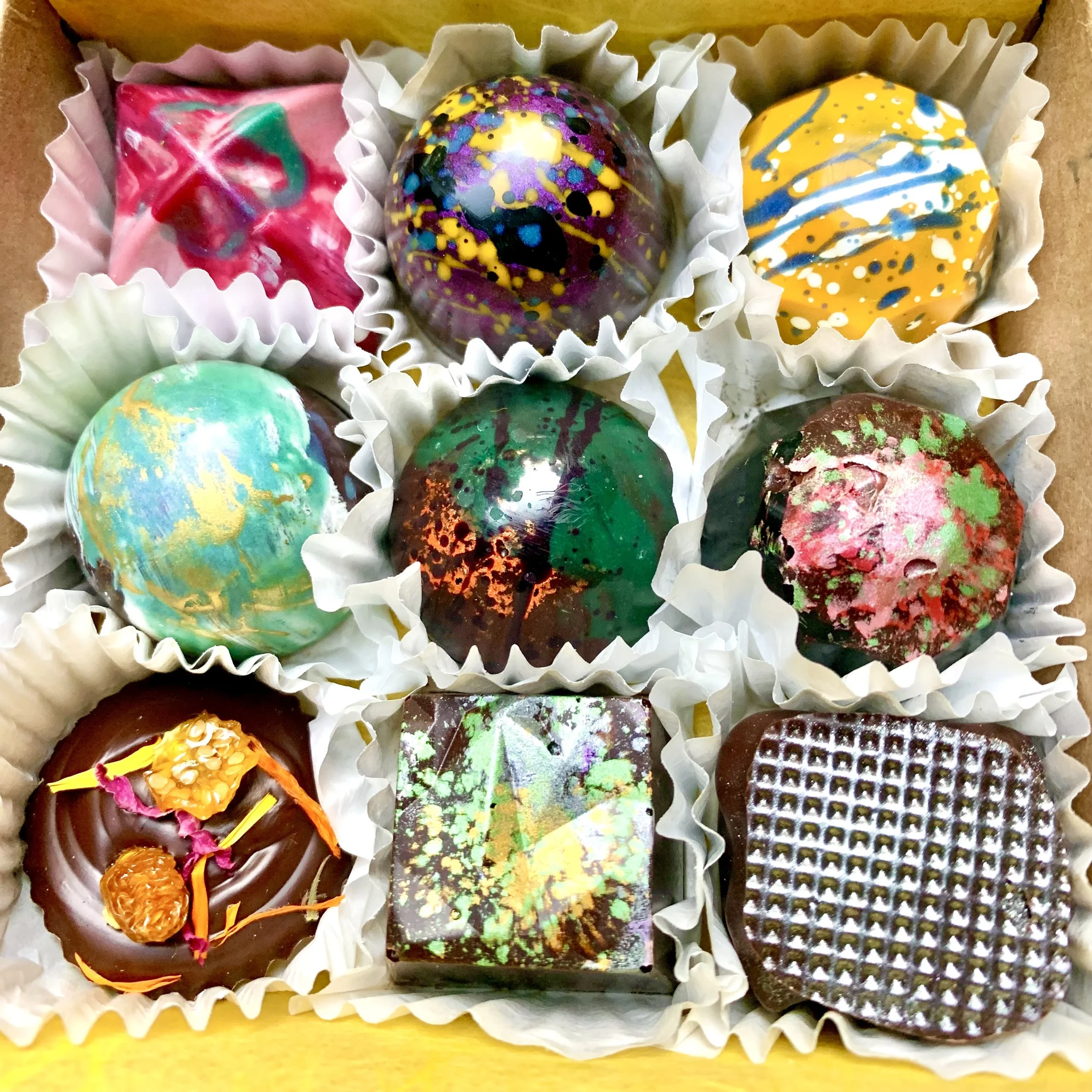 September Box: lemon verbena with fennel pollen marshmallow; roasted red pepper and raspberry; two mints; Thai basil with spicy peanut; lemon verbena with almond gianduja; espresso chocolate caramel; tomato caramel with ginger ganache; blueberry white chocolate caramel with corn milk chocolate ganache; mendiant of 70% Honduran with dried and honied husk cherries, calendula and rose petal.