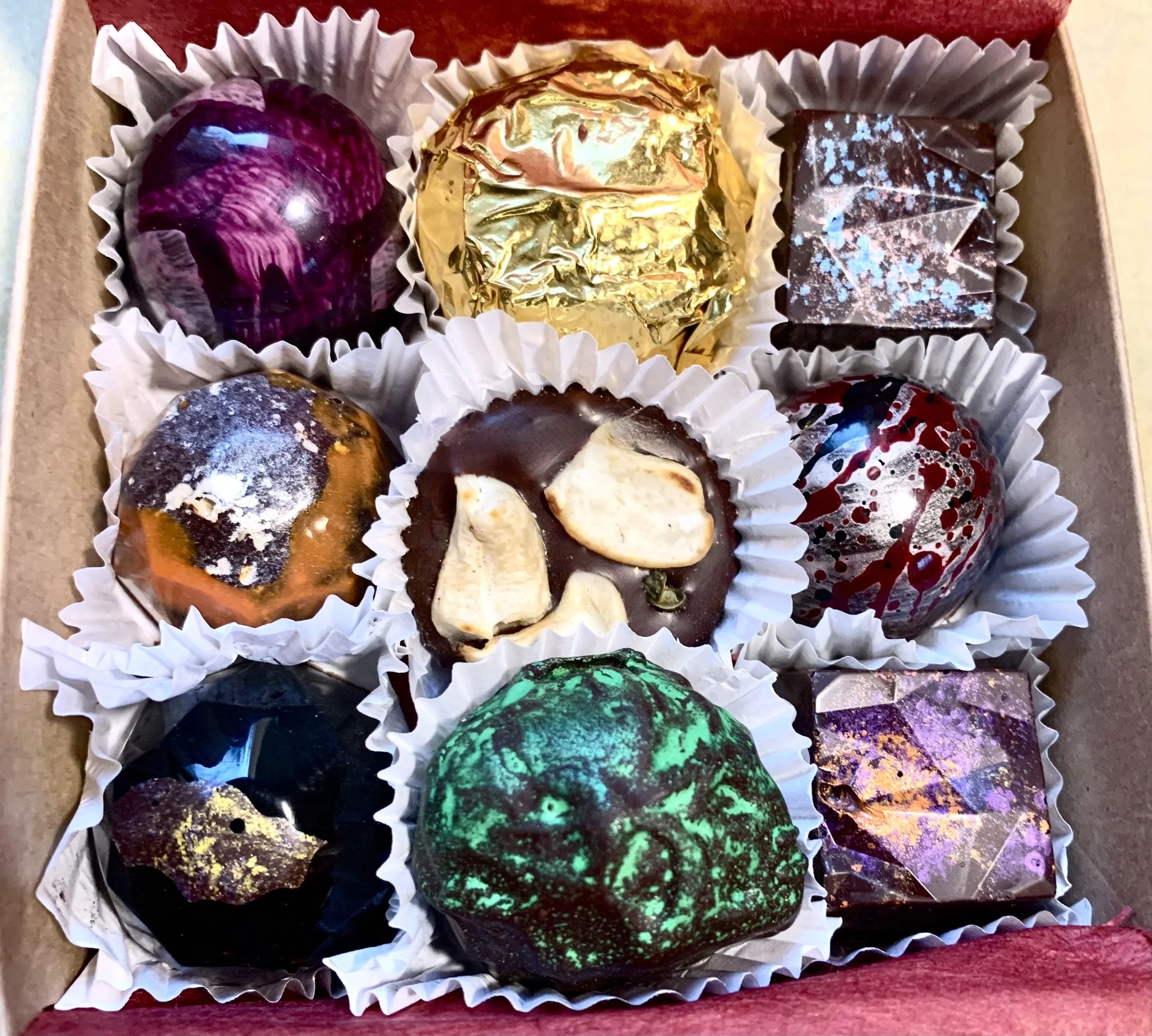 October Box: walnut gianduja and gin white chocolate; orange and Earl Grey; turmeric, cardamom, and cubeb milk chocolate; mulled cider caramel; vanilla, Tellicherry, and red long pepper; pawpaw coconut caramel; rum chocolate with Lapsang Soughing marshmallow, mendicant of Ecuadorian 40% milk chocolate with honeyed cranberries and toasted quinoa; winter savory and grape.